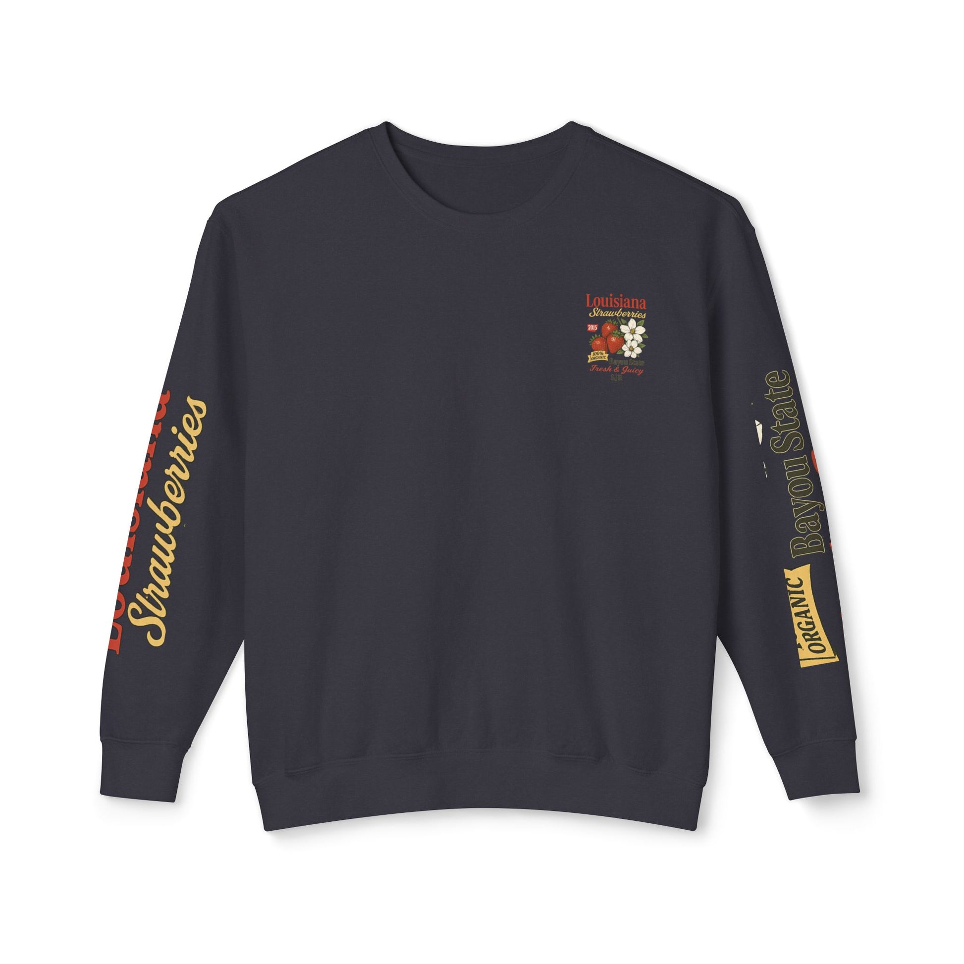 A lightweight crewneck printed with vintage farmstand charm. Soft, breathable cotton sits close to the skin without weight, carrying warm, sun-soaked colors and hand-drawn strawberry artwork across the back and a small chest emblem up front. Sleeve lettering and small badge details nod to Louisiana’s bayou farms — this sweatshirt slips on easily after a morning run to the market, layers under a denim jacket for a roadside picnic, or keeps the cool off during late-evening porch conversations. It feels lived-in from the first wear: relaxed through the body, with ribbed cuffs and hem that hold their shape as you reach, bend, and move. For people who love local food culture, slow afternoons, and the kind of graphics that tell a place-based story, this sweatshirt puts that feeling on your sleeve — quite literally.
